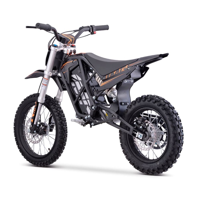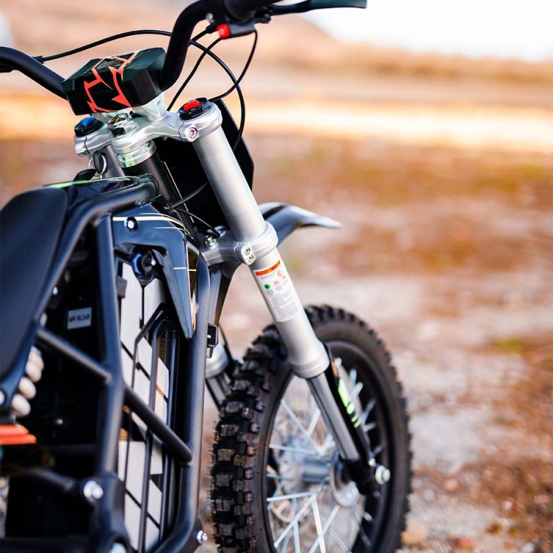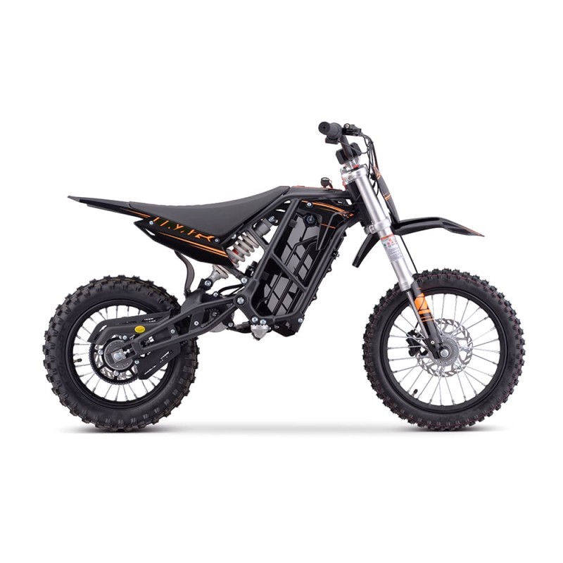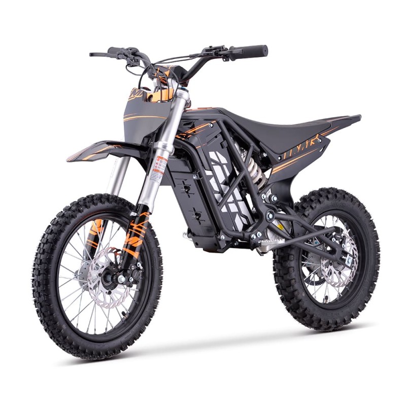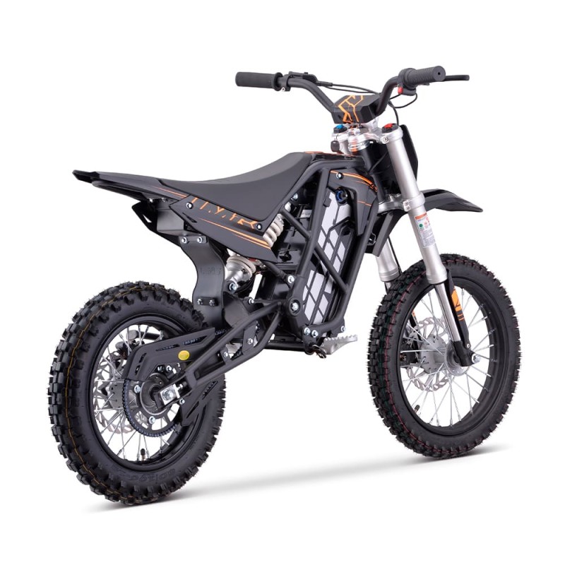 ¡Brutal! Nueva Minicross Eléctrica E-SX modelo IMR (2025) con motor de 2000W de potencia y bateria de litio de 60V. Autonomía de 2 horas y velocidad máxima de 53km/h. Suspensión delantera de horquilla invertida de 550mm y amortiguador trasero de 270mm. Freno delantero y trasero de accionamiento hidráulico y llantas de 14 y 12 pulgadas. Altura del asiento al suelo de 660mm